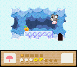 Take Coo when you reach the friend room in the level. Continue on as normal and eventually you'll find a room with a giant Umbrella mini-boss. You might need to disengage from Coo to beat him depending on your current powerup (I found it easier to beat him as Kirby alone, but it's up to you.) Remember to reclaim Coo once the boss is defeated, and go through the door that appears.