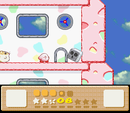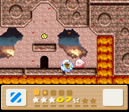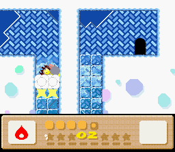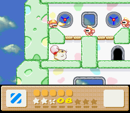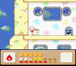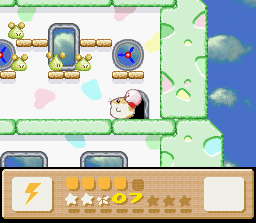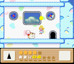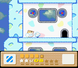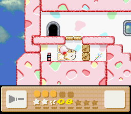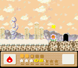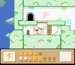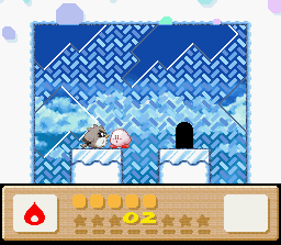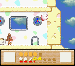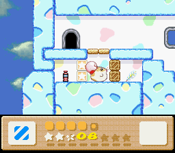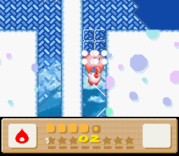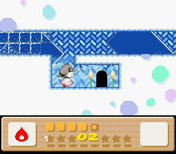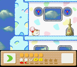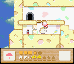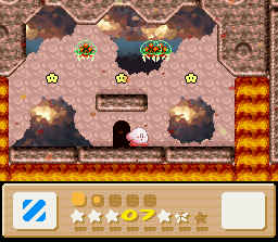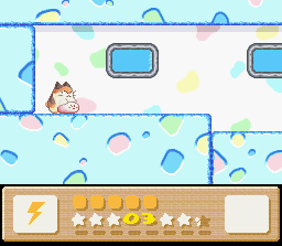 The goal of this stage is to get to the end with Nago. There are two problems with this: the first is that Nago cannot be found anywhere in the stage. You'll have to find him in an earlier stage and bring him here. The second problem is that since he can't be found in the stage, you can't afford to lose him, and therefore you must complete the whole thing in one life. This is easier said than done because the rooms of this level are simply designed to make you lose health. It's a lot easier if you also come into this level with a full life bar and the Fire powerup. I recommend getting all of these things (Nago, full health, Fire) by using the Popstar to go all the way back to Level 1-1. When you finally return here and make it to the end of the stage, the white cat will give up her Star for kitty love.