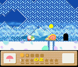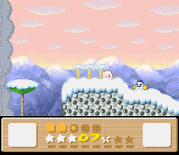 As you fall down this shaft, look for a snail shell in a nook on the right wall. You might miss if you fall too fast, so fly back up to it if you do. When you reach the end of the stage, a snail will give you the Star. (He's probably really grateful to have that shell back considering the cold weather in this area.)