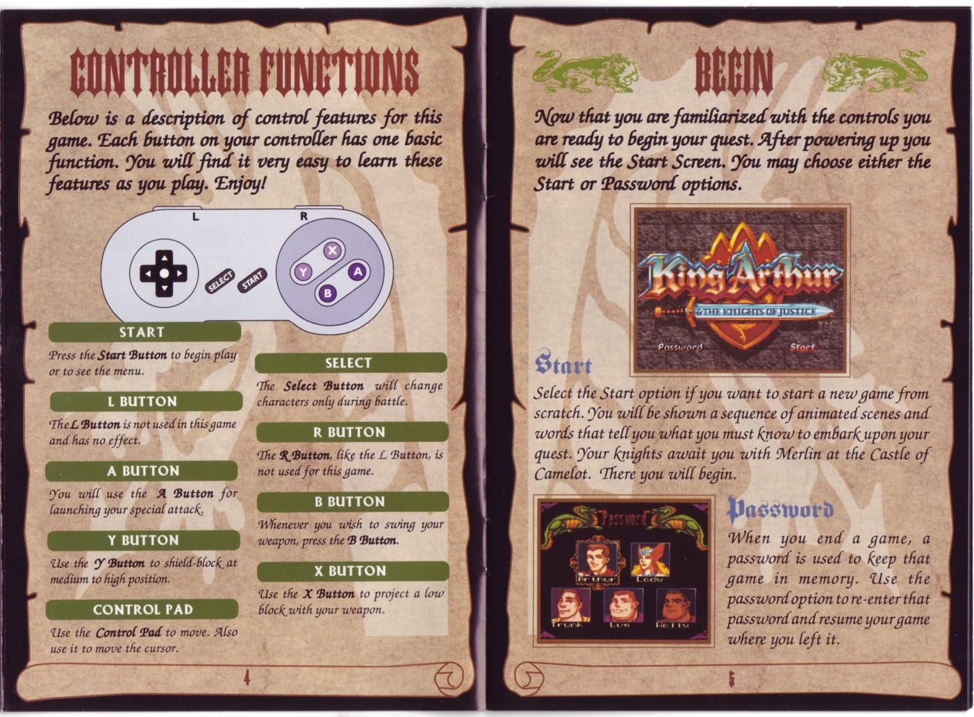 Page 4 (Controller Functions) and Page 5 (Begin)