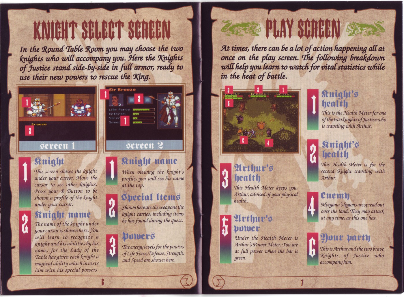 Page 6 (Knight Select Screen) and Page 7 (Play Screen)