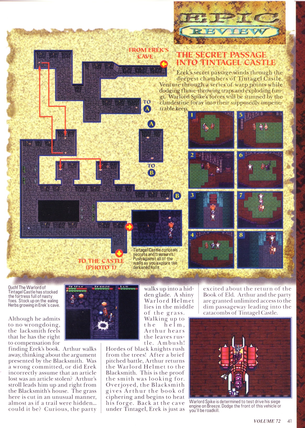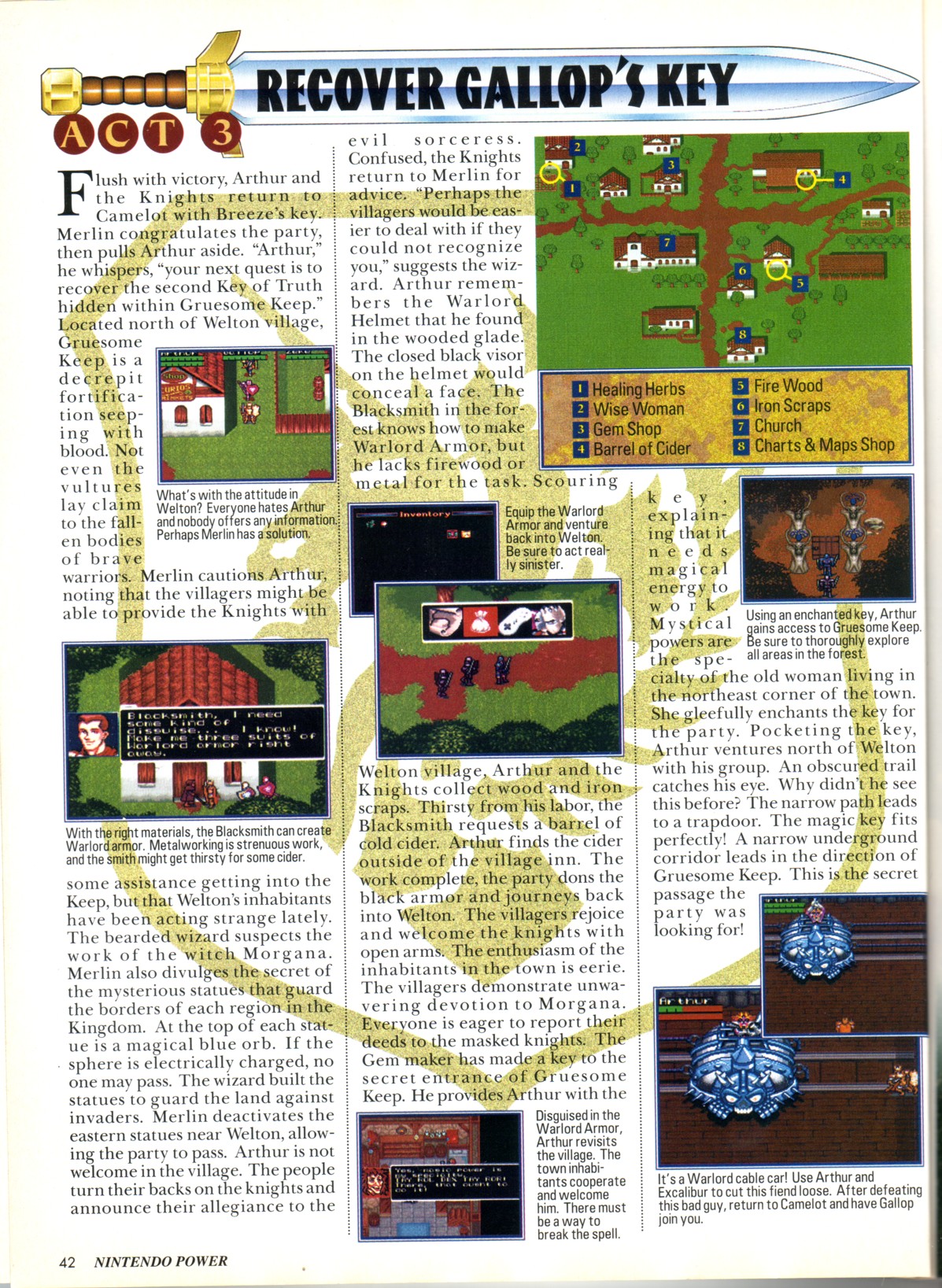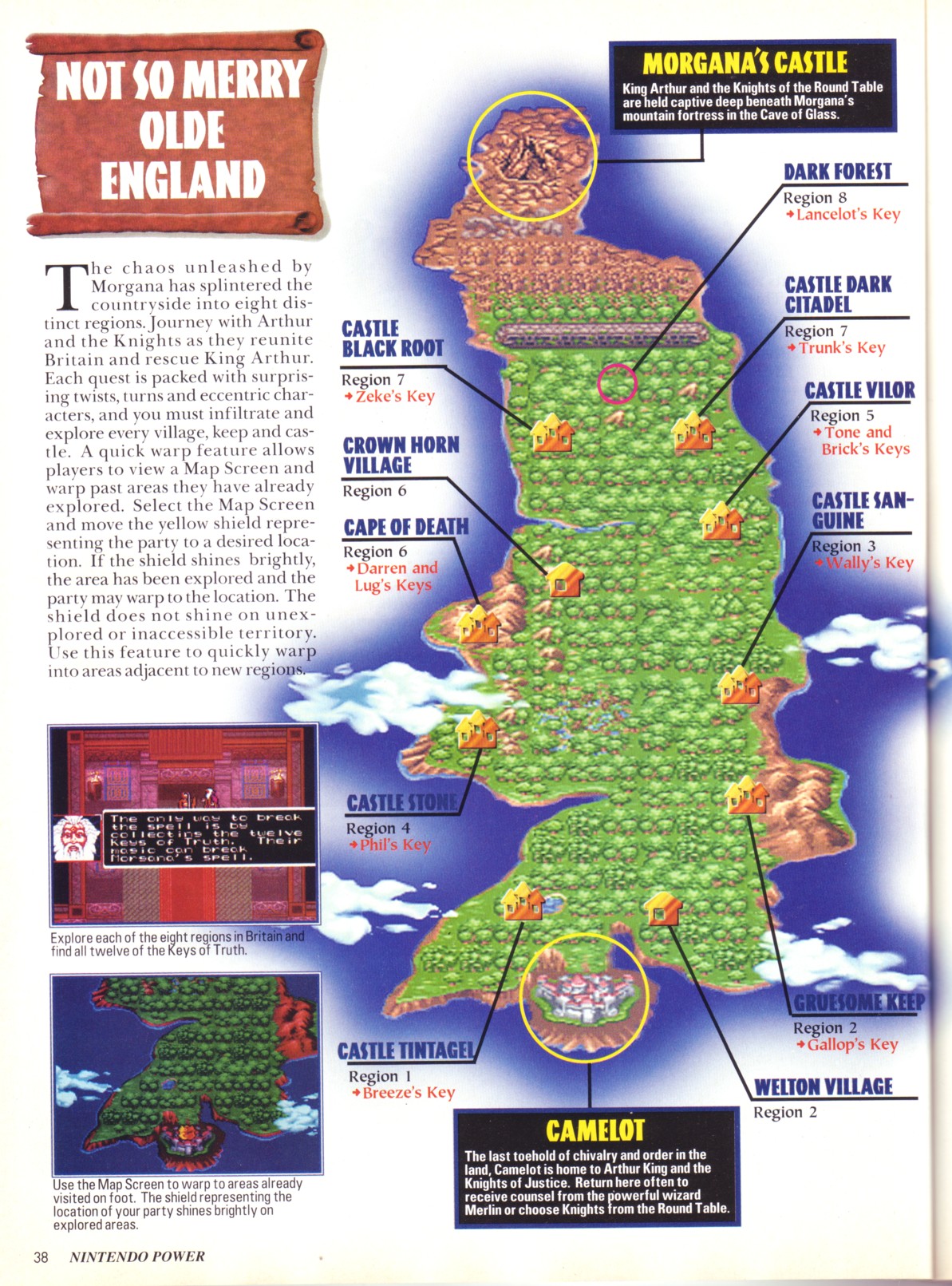 Note #9: This scan includes a map of the overworld with all the castles and towns marked on it. This map calls the fortress where you get Darren's key the "Cape of Death". It is not named in the actual game. Also, the location of the Dark Forest is mismarked. It should be behind Hadrian's Wall, not in front of it.