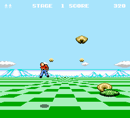 And while we're on the subject of Sega games on the NES...It seems like before Square became big in the RPG field, they spent their early years making NES rip-offs of Sega games! Rad Racer is an NES cross-country auto racing game that is very similar to Outrun. They even both have a red car and the ability to choose the background music. The 3D Battles of WorldRunner (or just 3D WorldRunner) is very similar to Space Harrier. They are both behind-the-back perspective shooting games in which you control a running man instead of a ship. They have similar graphic styles and segmented Dragon bosses. The one major difference is that WorldRunner cannot fly except when fighting the bosses, whereas Space Harrier can fly whenever you want him to. Here are some screenshots: